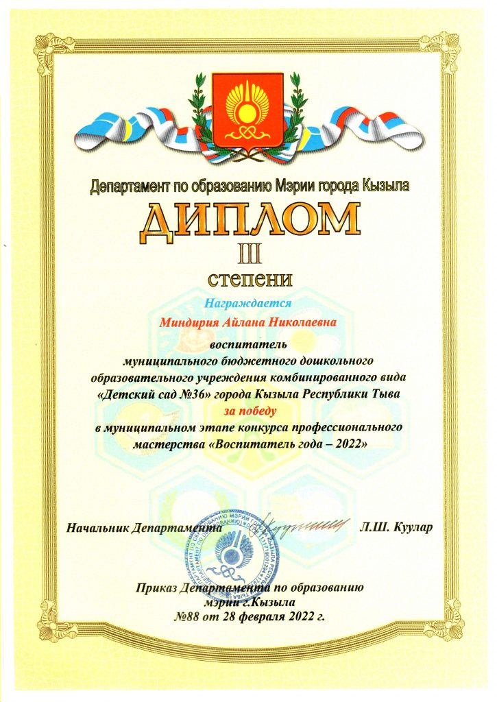 04 марта 2022 года состоялась торжественная церемония награждения победителей, лауреатов, номинантов муниципального этапа конкурса профессионального мастерства «Воспитатель года — 2022», где участвовала воспитатель младшей группы №1 «Малышок» нашего ДОУ, Миндирия Айлана Николаевна, которая стала дипломантом III — степени. Поздравляем!!!