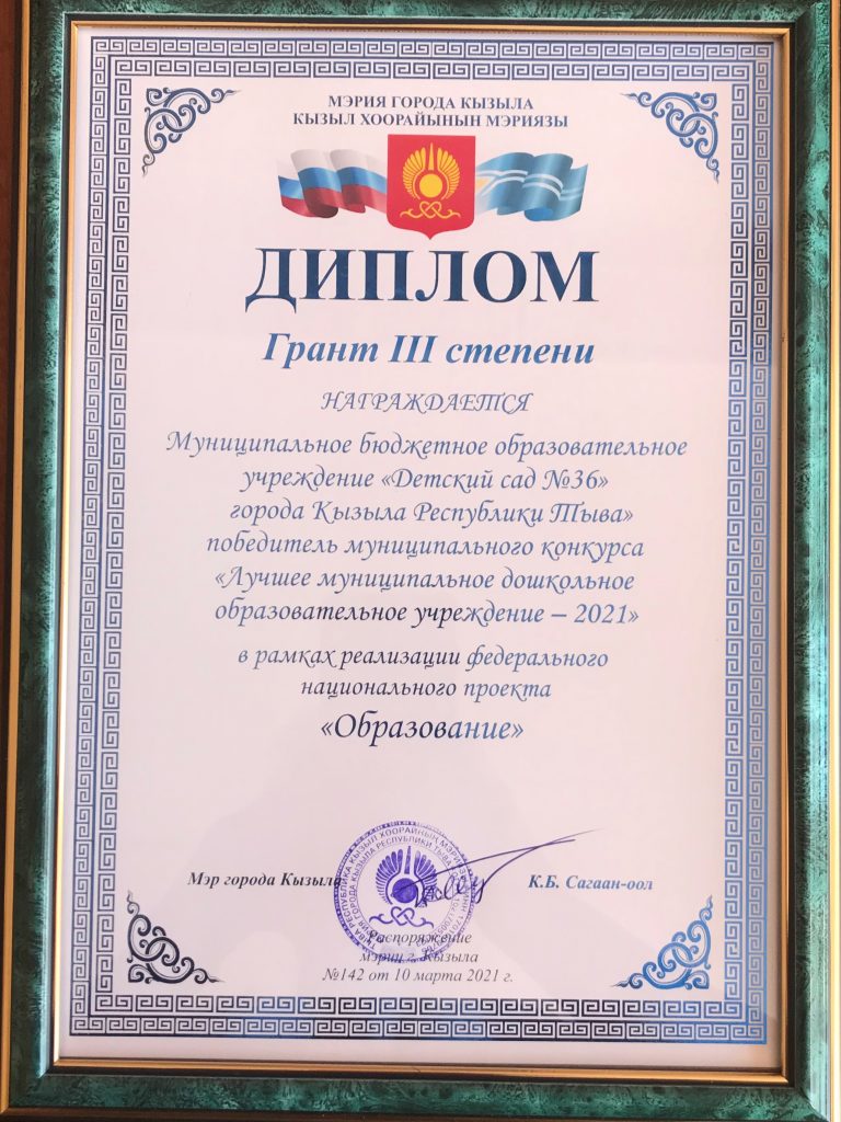 В рамках реализации Федерального национального проекта «Образование» в нашем городе прошел конкурс «Лучшее муниципальное дошкольное образовательное учреждение — 2021» наш детский сад стал дипломантами III — степени, а также получили Грант мэра III -степени. Поздравляем!!!